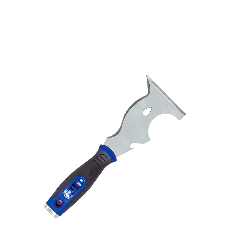 Espátula en acero inoxidable, espátula cóncava, espátula convexa, multifuncional, limpia rodillos, limpia grietas, destornillador. Phillips No.2, destornillador plano 1/4, destornillador plano 3/16, destapador, remueve, aplica, saca clavos, abre latas y martilla.