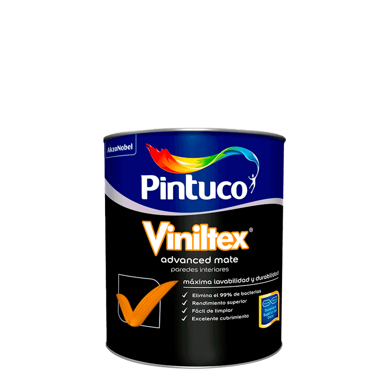 Viniltex Advanced es una pintura premium a base de agua, para paredes interiores. Con máxima lavabilidad, y tiene un activo antibacteriano que elimina el 99,9% de las bacterias.