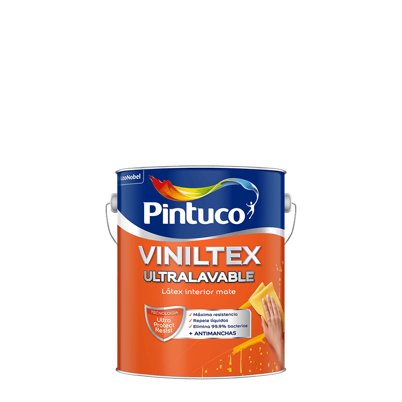 Viniltex Ultralavable es una pintura mate para interiores de máxima resistencia a las manchas, ya que repele los líquidos y evita la adherencia de las suciedad. Elimina el 99% de las bacterias.