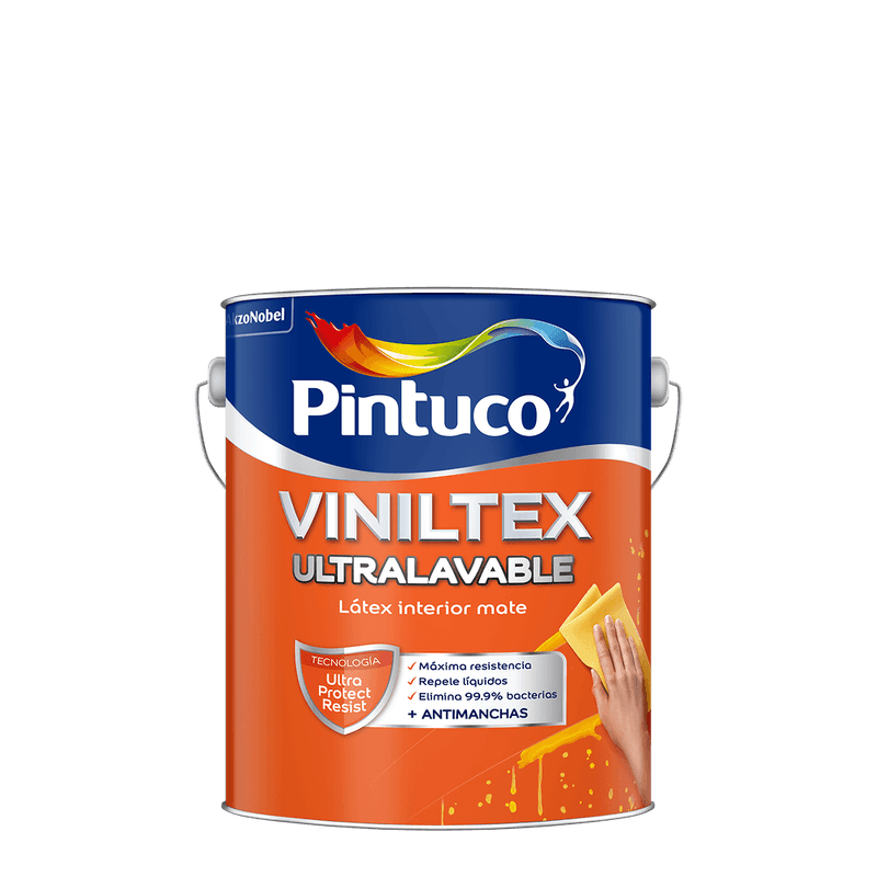 Viniltex Ultralavable es una pintura mate para interiores de máxima resistencia a las manchas, ya que repele los líquidos y evita la adherencia de las suciedad. Elimina el 99% de las bacterias.